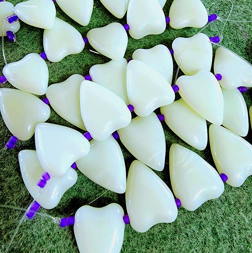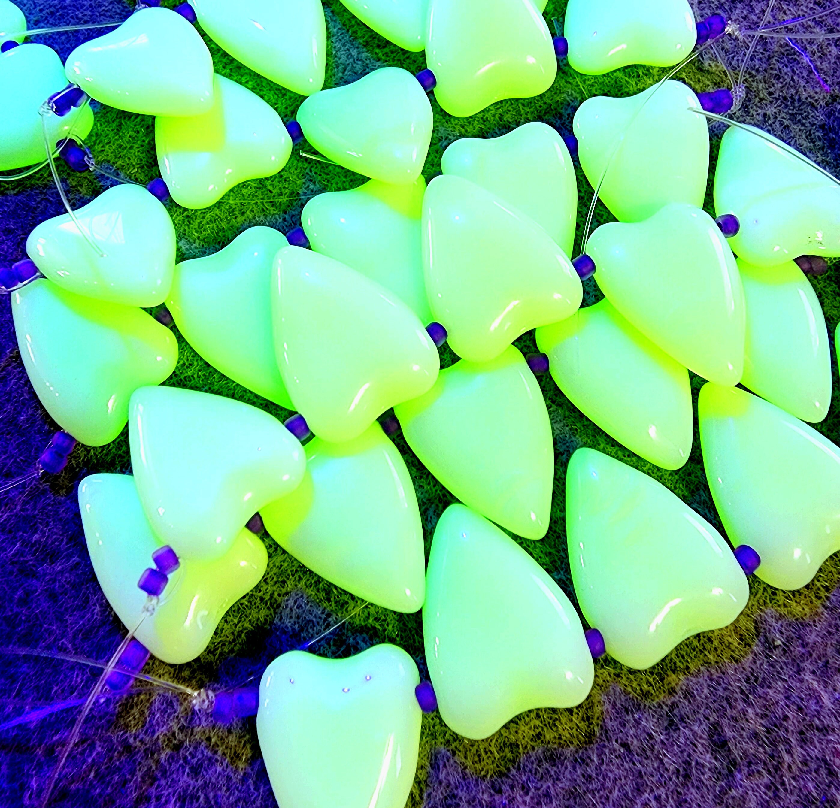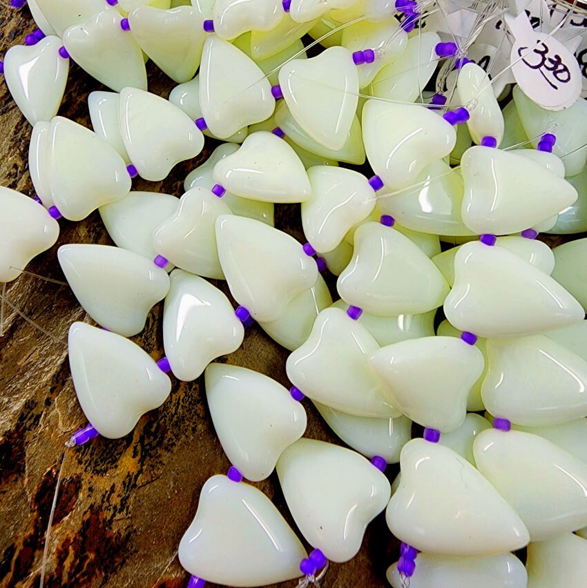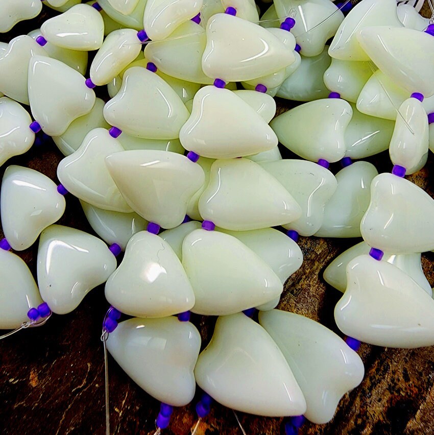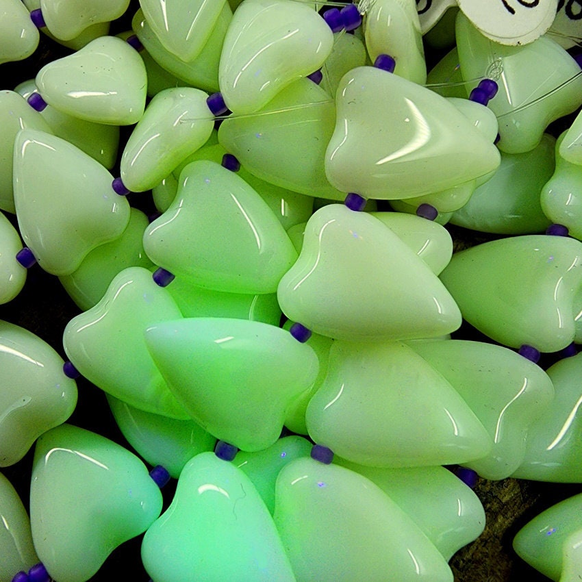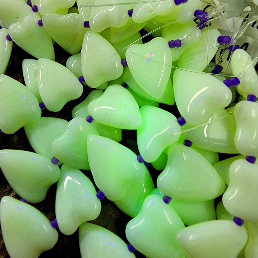 The color on these beads is scrumptious! These particular beauties are made from Uranium glass and will glow under black/ultraviolet light. I actually like them for the beautiful shades these VINTAGE beads come in: Pink, Glow Yellow, Lime, Opal Yellow, Opal Lime, Opal Mint - and these play well with so many other colors!