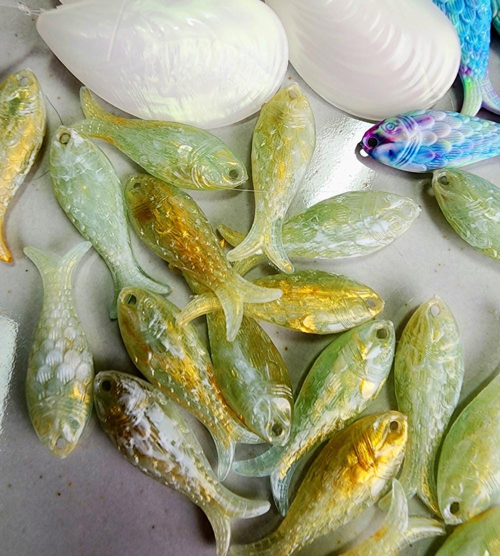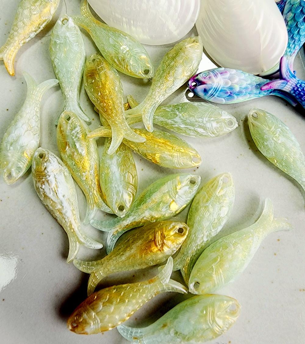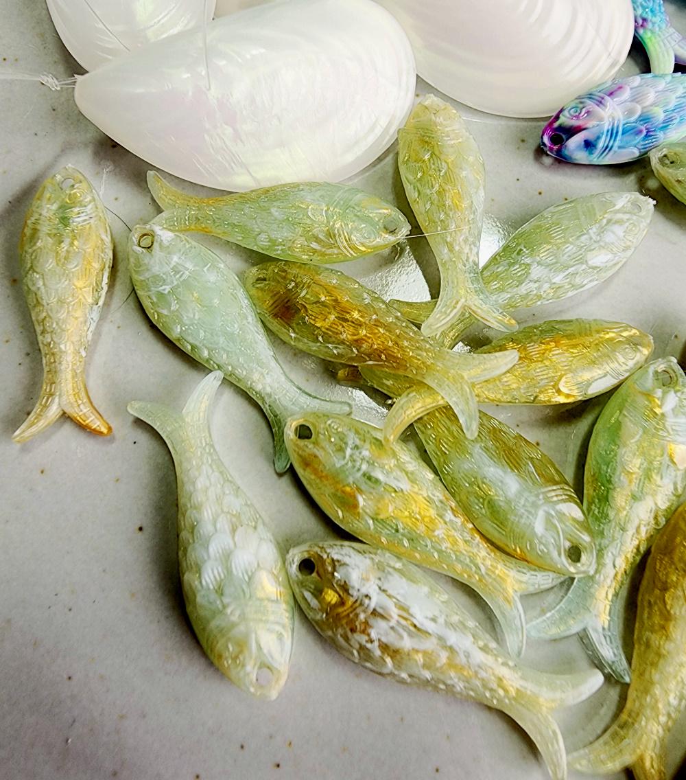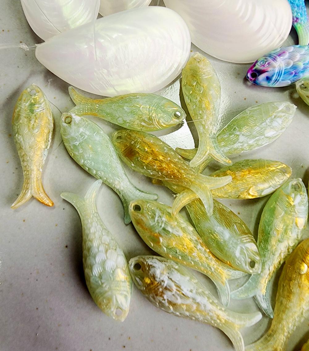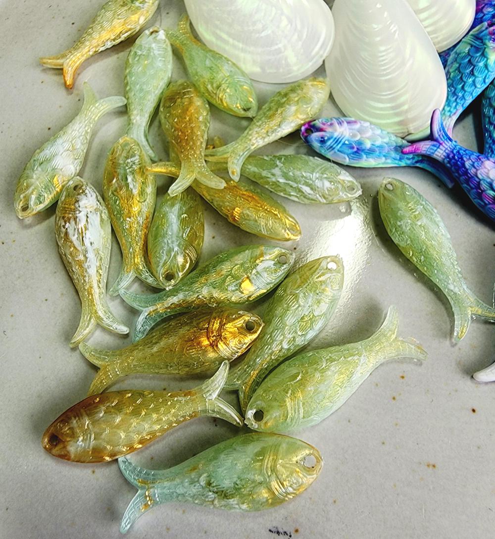 Lucite Fish Component 27x9x5mm Marbled Sage/Gold Iridescent PRICED PER PIECE