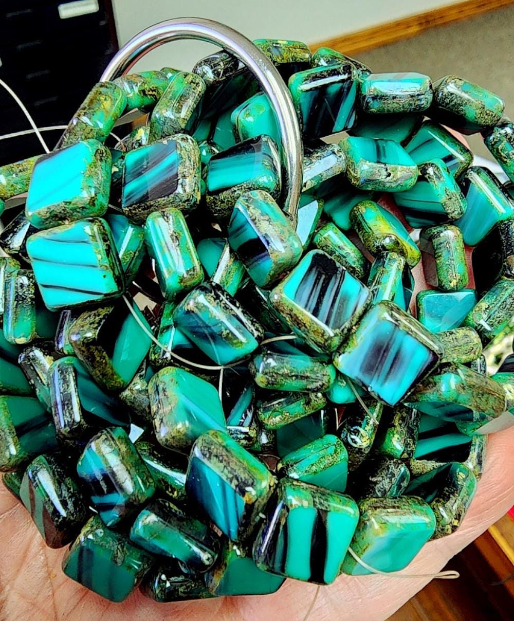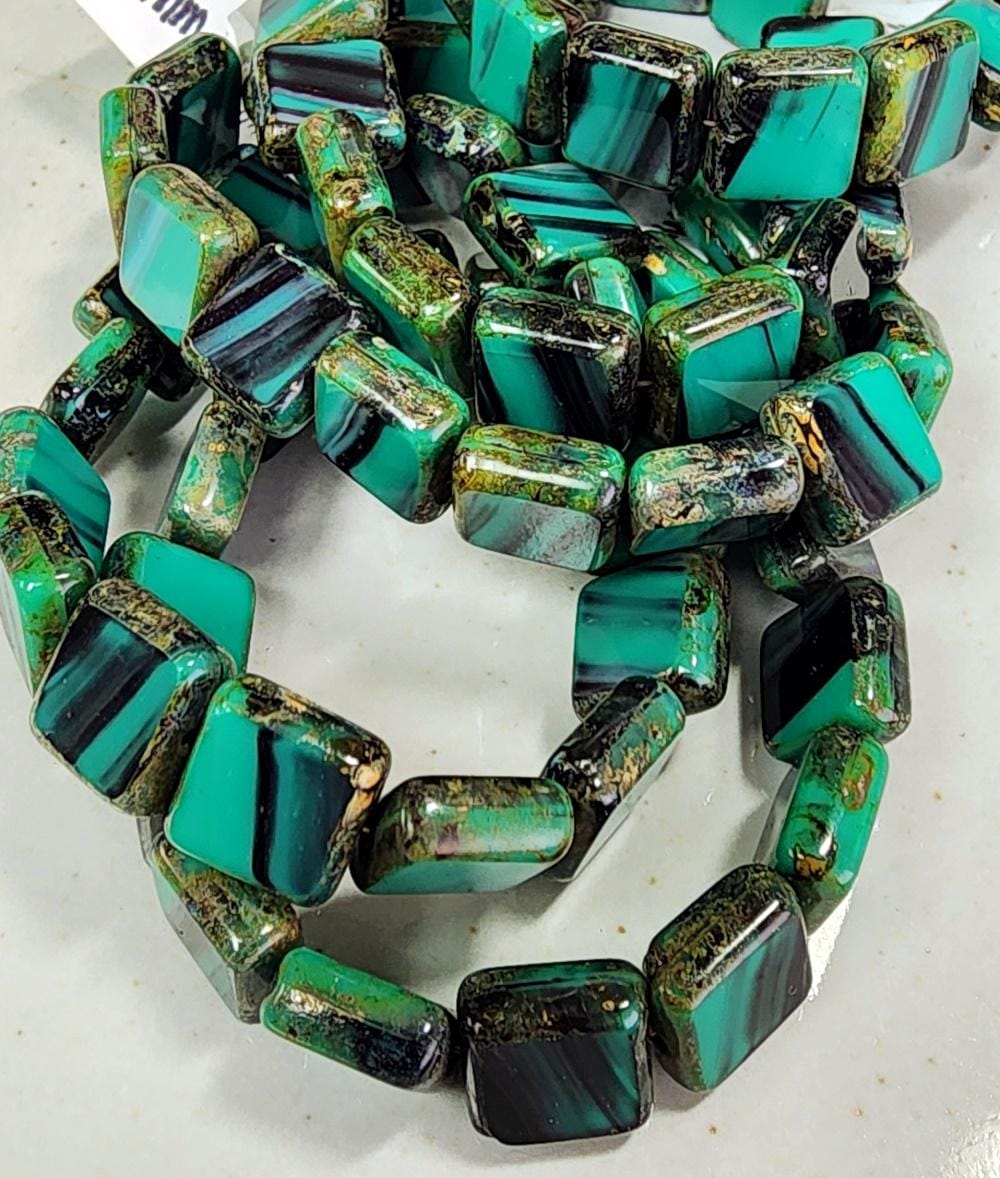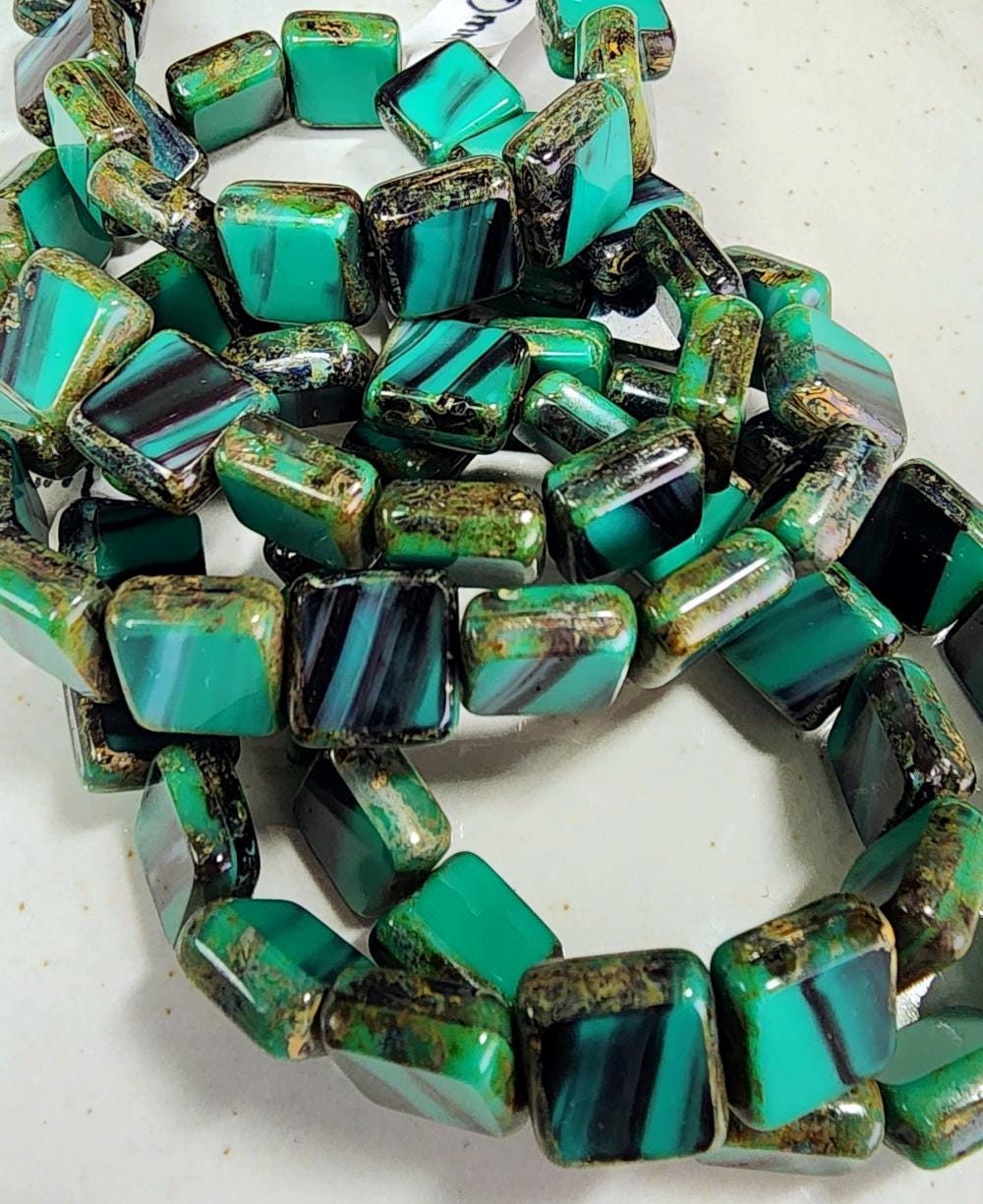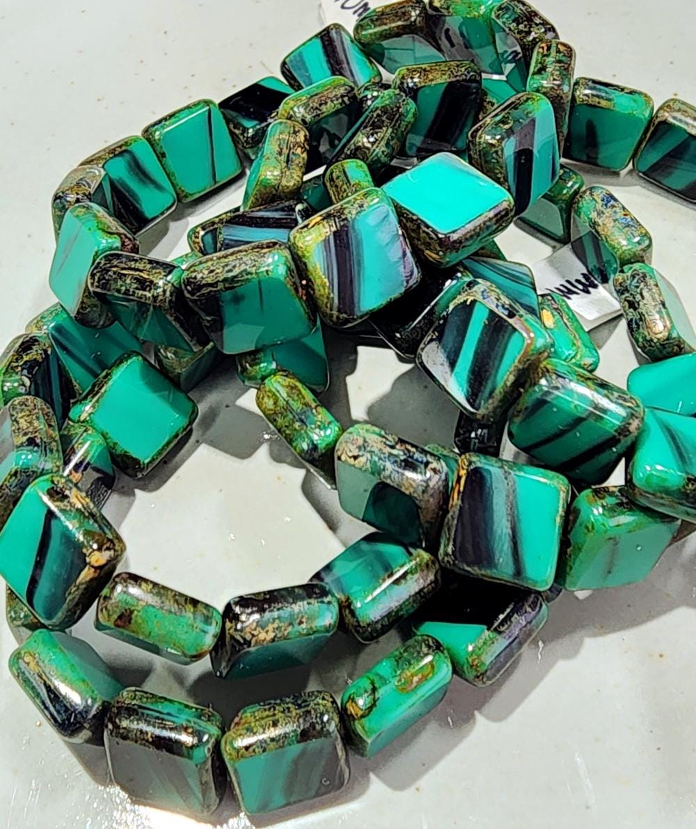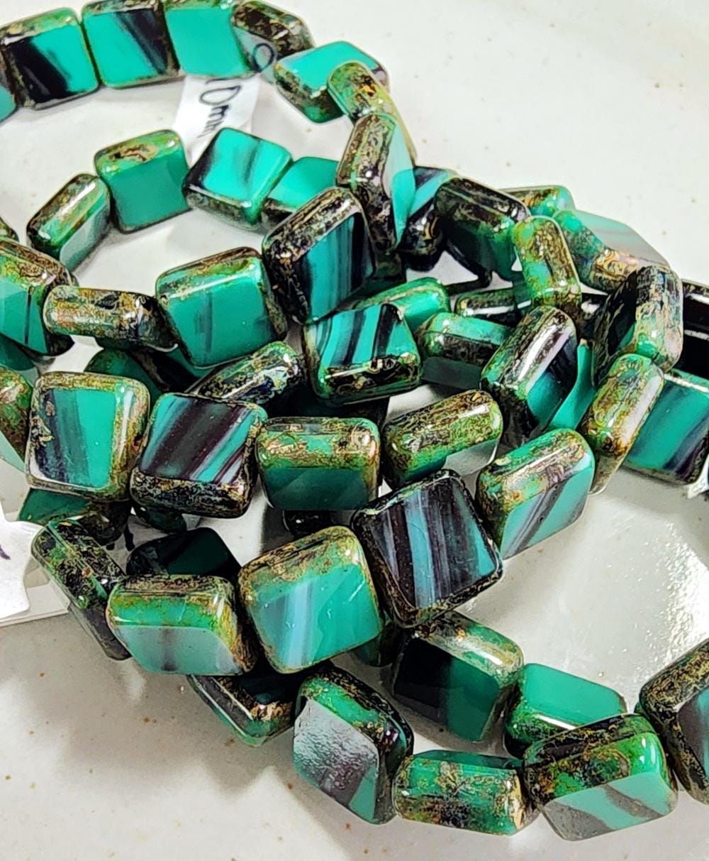 Dark Turquoise Green, Black, Mixed, Picasso, Table Cut, Square, 10mm, Czech Glass, 15 Pieces per Strand, Priced per Strand