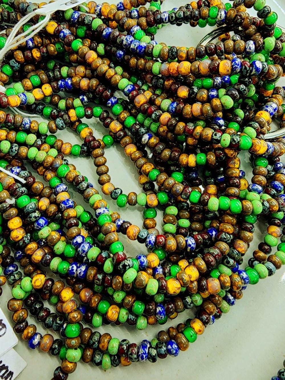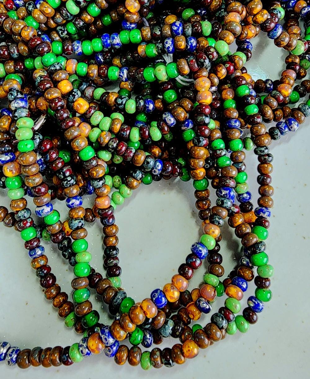 9 beads per inch - mix contains: cobalt, silver, green, yellow ochre, browns, deep red. I've sold beads for over 20 years. As with all items I sell - I'm all about quality!