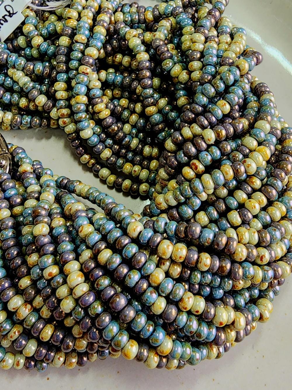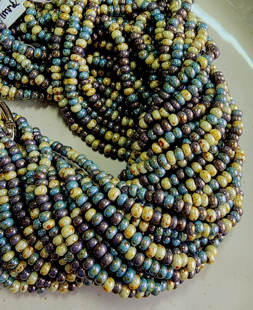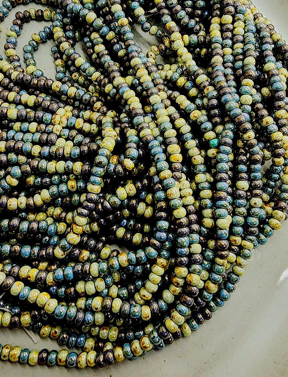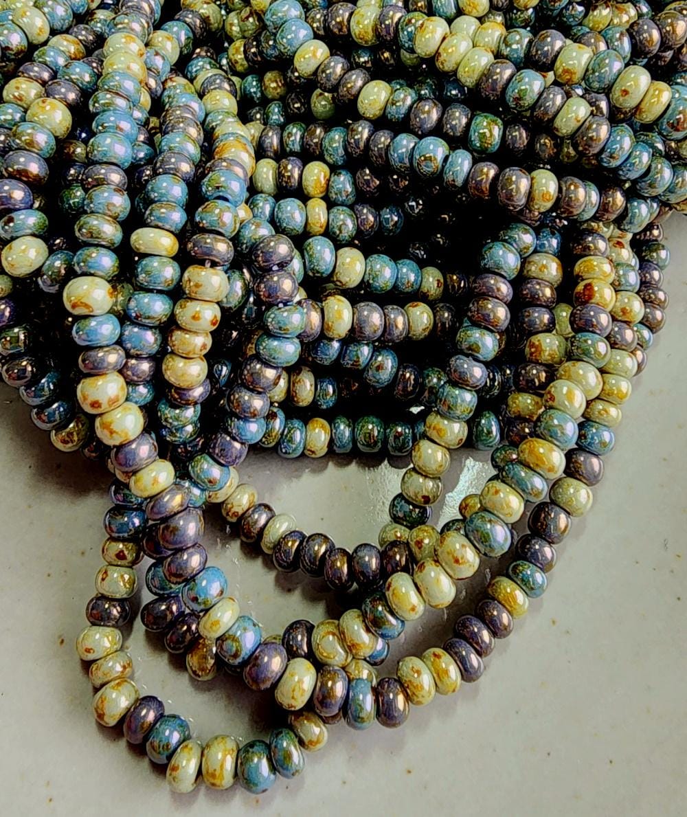Almond, Picasso, Luster, Mixed, Seed Beads, 6/0, Rocaille, Czech Glass, 20 inch (9bds/inch), Priced per strand