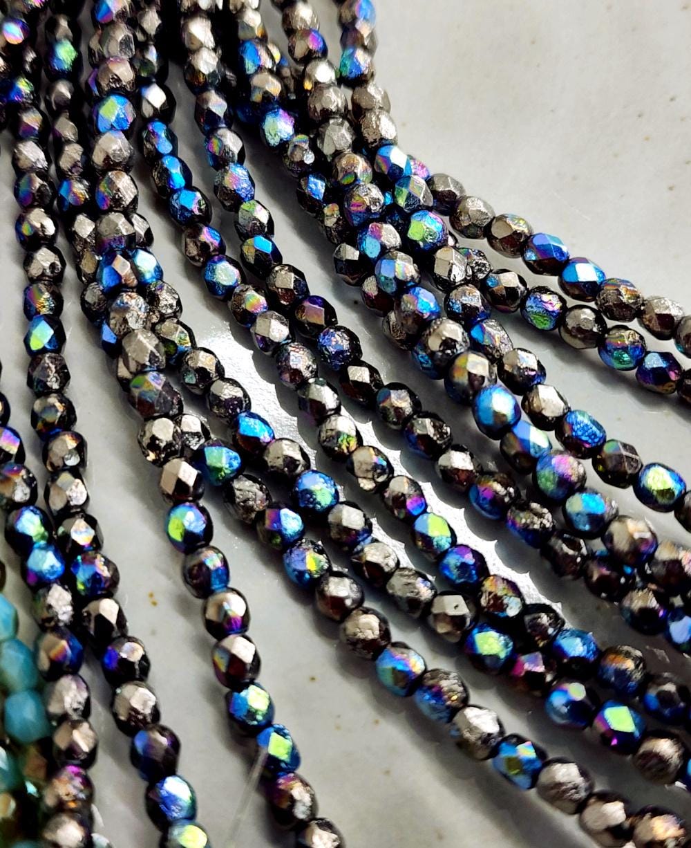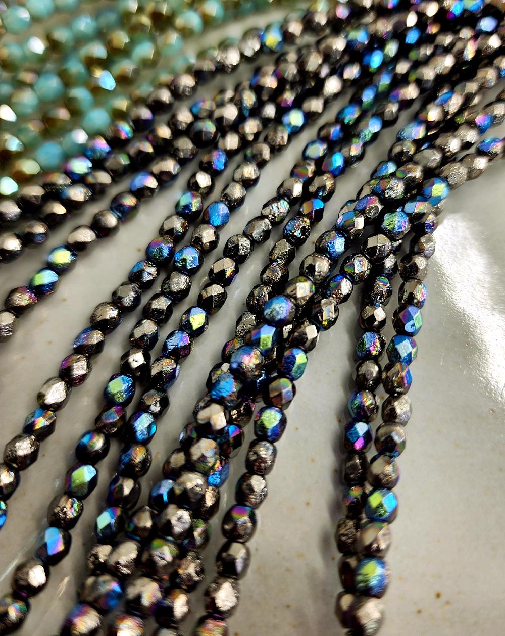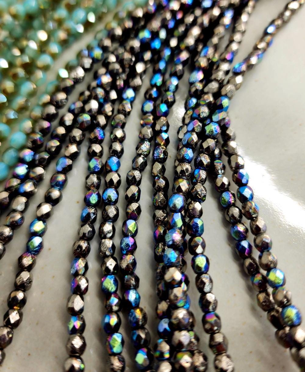 Chrome, Dark Silver, AB, ETCHED, 4mm, Firepolish, Rounds, Czech Glass, 50 Beads per Strand, Priced per Strand